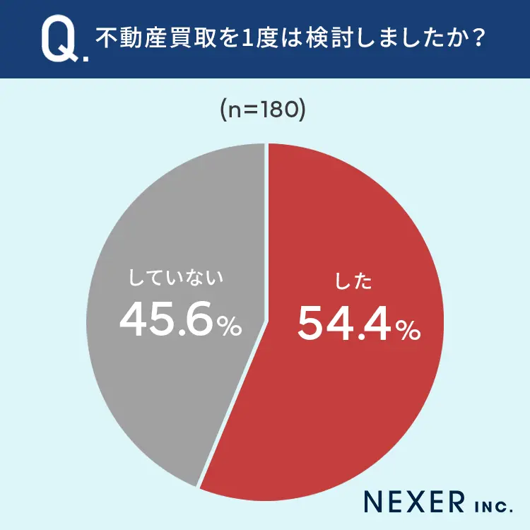 なお、株式会社NEXERとTAQSIE(タクシエ)が仲介で不動産を売却した方を対象に実施した調査では、54.4%の方が不動産買取を一度は検討したと答えています。