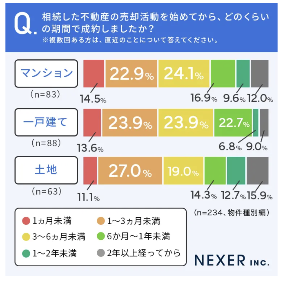 参考までに、株式会社NEXERとTAQSIE(タクシエ)が相続した不動産の売却にかかった期間を調査したところ、マンションは3〜6ヶ月未満での売却が多い傾向です。