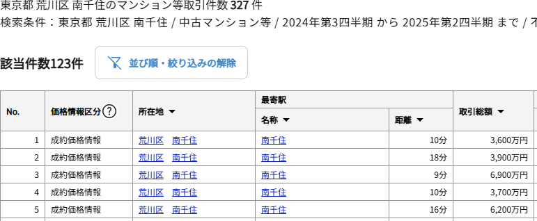 表示される取引情報から、もっとも近い条件の物件を探します。今回は、12番と13番が比較的条件が近いことがわかりました。