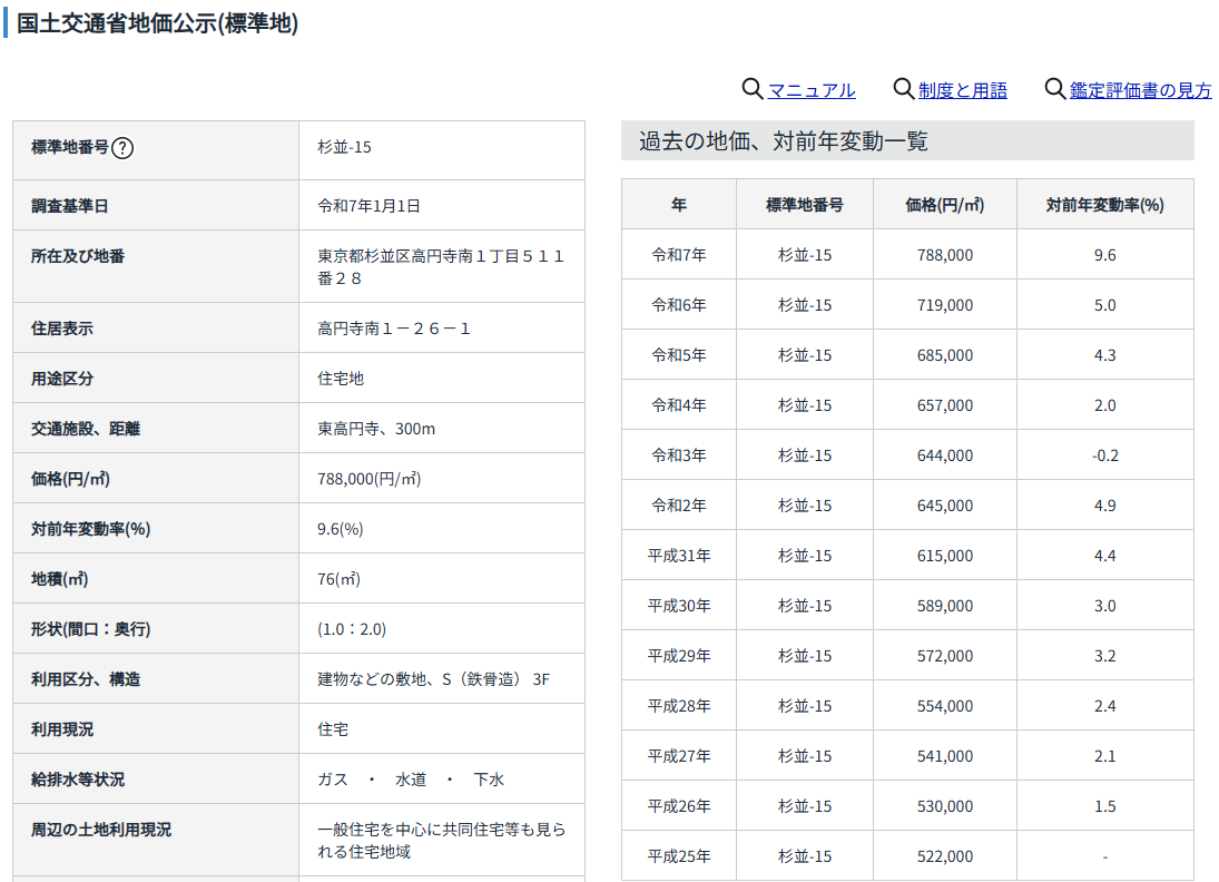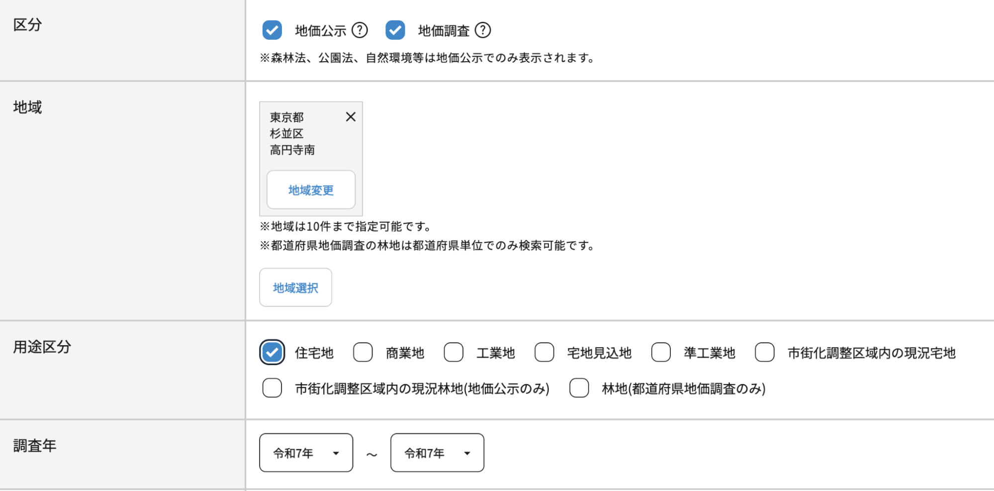 たとえば、東京都杉並区高円寺南の住宅地の土地を調べたい場合は、以下のように検索条件を設定します。