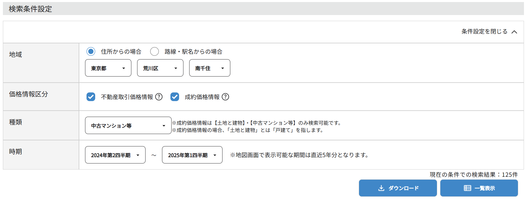 - 価格情報区分:不動産取引価格情報、成約価格情報にチェック