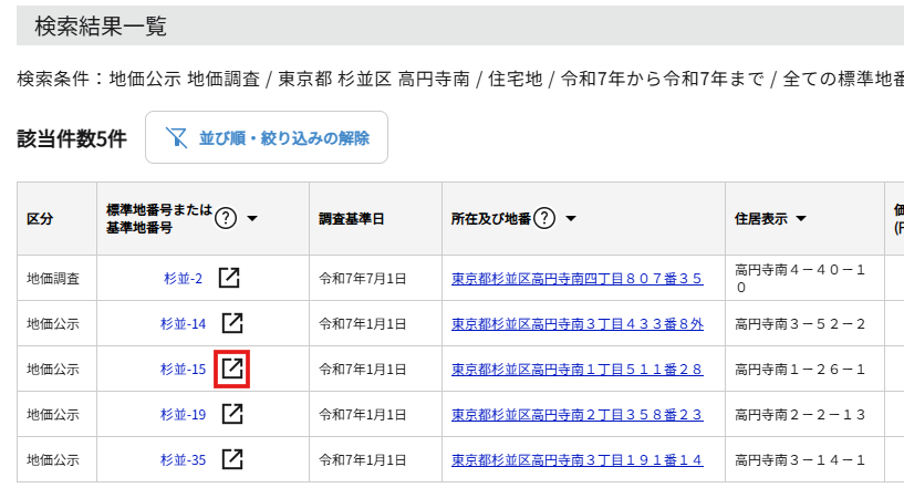 たとえば、高円寺南1丁目にある土地の相場を知りたい場合は、「標準地番号または基準地番号」の列にある「杉並-15」の横に記載されたマーク(赤で囲ってあるマーク)をクリックします。