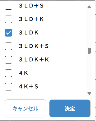 各項目でデータを絞り込むことも可能です。たとえば、3LDKのマンションを探したい場合は「専有部分」の「間取り」の右にある▼をクリックし、「3LDK」にチェックを入れるとデータの絞り込みができます。